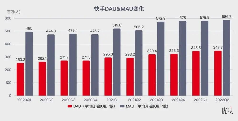 从用户数据来看,2022Q2 快手 MAU(平均月活跃用户)达 5.86 亿,同比增长 15.9%;DAU(平均日活跃用户)达 3.47 亿,同比增长 18.5%,创历史新高;用户总流量同比增长 38.7%,也创下历史新高。